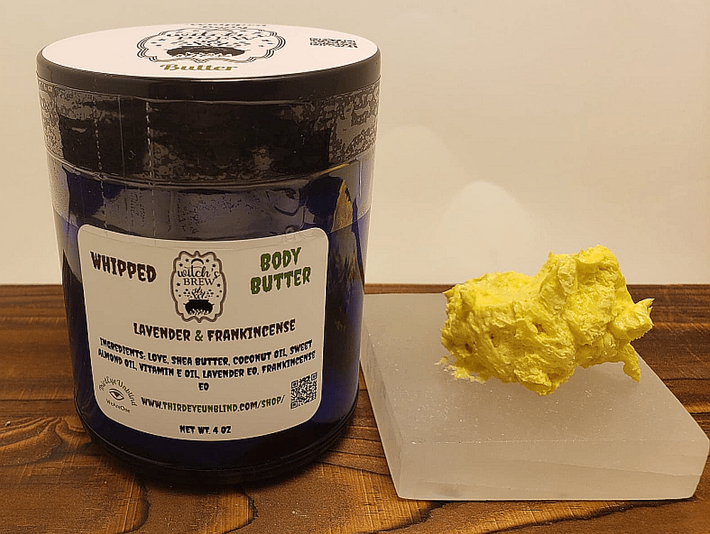 Ingredients: Love, Raw Unrefined African Shea Butter*, Unrefined Coconut Oil*, Unrefined Cold Pressed Sweet Almond Oil or Unrefined Cold Pressed Hemp Oil, Vitamin E Oil, Lavender EO, Frankincense EO